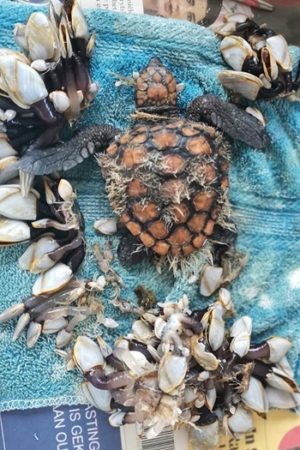Foto (Two Oceans Aquarium Foundation (TOAF)): Schildkröte,die von einer dicken Schicht Entenmuscheln befreit wurde.