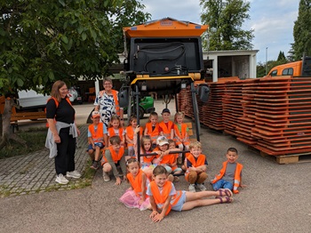 ‚Unsere Stadt Eislingen entdecken‘ hieß das Projekt,das die 3- bis 6-Jährigen zu den Mitarbeitenden auf den Betriebshof führte. Und auf dem Betriebshof gab es einiges zu sehen. Auf die Frage der Erzieherinnen,was denn der Bauhof macht,meinten alle: „Natürlich bauen!“ Mit einer Erfrischung im Vesperraum der Mitarbeitenden war das Eis schnell gebrochen. „Wenn ich das nächste Mal wieder komme,esse ich auch hier“,stellte ein Kind selbstbewusst fest. Mit Warnwesten ausgerüstet ging es für die Gruppe auf den Hof. Dort durften alle eine Runde mit der großen Kehrmaschine mitfahren. Die Kinder waren beeindruckt. Vorbei ging es an den Hallen zum Salzlager für die Streufahrzeuge.