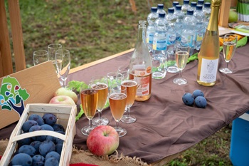 Foto (Gunther Willinger): Mitten in den Streuobstwiesen eröffnete das Streuobstparadies mit Secco,Zwetschgen und Jakob Fischer den Verkaufsstart der Handelsplattform