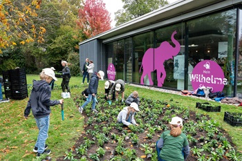 Am 24. Oktober 2024 durften sich die Gärtnerinnen und Gärtner aus dem Fachbereich Parkpflege der Wilhelma über zahlreiche helfende Hände freuen: Eine Gruppe der Europa Minigärtner war nämlich einen Nachmittag lang zu Gast im Zoologisch-Botanischen Garten Stuttgart. Die 17 Schülerinnen und Schüler aus der eigentlich 20-köpfigen von Catharina Maier geleiteten Minigärtnergruppe der Filderschule in Degerloch hatten die Aufgabe,ein 50 m² großes Wechselflorbeet vor dem Wilhelma Shop zu bepflanzen.