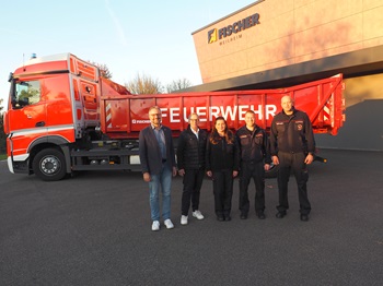 Foto (Stadt Uhingen): Die Uhinger Delegation bestehend aus Bürgermeister Matthias Wittlinger (links) sowie (von rechts) Kommandant Steffen Kwiatkowski,Gerätewart Heiko Streicher sowie Verwaltungsmitarbeiterin und FFW-Mitglied Jenny Streicher holt die Mulde in Weilheim bei der Firma FISCHER ab,wo sie von Geschäftsführer Frank Bahner (Zweiter von links) überreicht wurde.