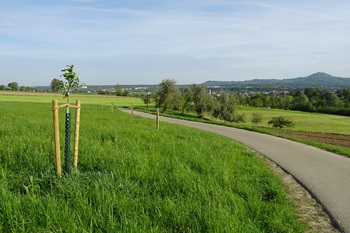 Foto (Bildquelle: Stadt Eislingen): Neu gepflanzte Obstbäume säumen den Weg zum Eislinger Waldheim und verbinden Streuobstbestände miteinander. Der Verbund von Biotopen fördert somit die Ausbreitung und den Austausch von Tierarten.