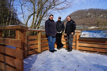 Foto (Stadtverwaltung Geislingen an der Steige / Christiane Wehnert): Bauhofleiter Dieter Seng sowie die Schreiner Ingo Strunz und Alexander Stottele auf der neuen Aussichtsplattform am Biotop im Rohrachtal