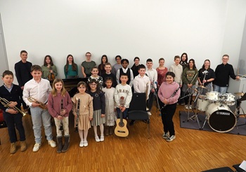 Foto (Stadt Uhingen): 27 Musikschülerinnen und Musikschüler zwischen 6 und über 60 Jahren zeigen im Uditorium,welche Instrumente sie erlernt haben.