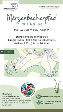 Pünktlich zur Blütezeit der Märzenbecher hat die Tourist-Information Bad Überkingen in Zusammenarbeit mit der Spielplatz-Initiative Bad Überkingen eine Märzenbecher-Rallye ins Leben gerufen. Dieses neue Naturerlebnis lädt Familien und Naturfreunde dazu ein,die Besonderheiten des Autals auf spielerische Weise zu entdecken.