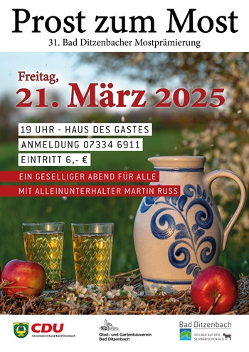 Zur 31. Bad Ditzenbacher Mostprämierung am Freitag,21. März 2025 im Haus des Gastes laden die Veranstalter herzlich ein. Beginn der Veranstaltung ist um 19 Uhr.