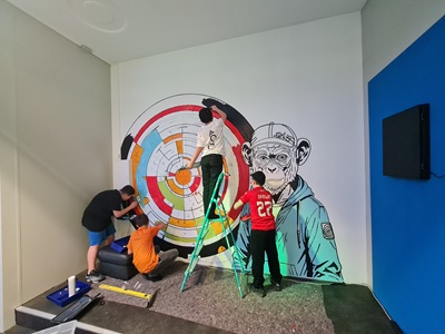 Foto (Bildquelle: Jugendhaus Nonstop): Vier Jugendhausbesucher malen das neue Motiv im Nonstop an die Wand.