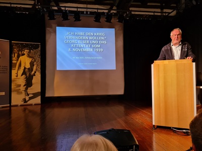 Begleitend zur Ausstellung „Georg Elser und sein Attentat vom 8. November 1939“ hatte die Stadt Süßen am 8. Mai 2025 zu einem Vortragsabend in die Zehntscheuer eingeladen. Gleichzeitig war dies der 80. Jahrestag des Endes des Zweiten Weltkriegs in Deutschland.