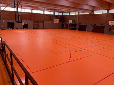 Statt punktuell den Boden rund um die Bodenhülsen zu erneuern,wurde gleich der gesamte Hallenbelag erneuert.