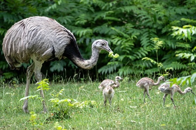 Foto (Birger Meierjohann,Wilhelma): Nandu-Hahn Peter mit Nachwuchs