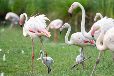 Rosaflamingos fühlen sich nur in Gesellschaft wohl: Auch in der Natur brüten sie daher kolonieweise. Als Nistplatz häufen Sie im flachen Wasser einen Schlammhügel auf,in den sie eine Mulde formen,in welche in der Regel ein Ei gelegt wird. Nach gut vier Wochen Brutzeit schlüpfen die Küken,deren Körper noch von einem dichten,weißen Dunenkleid bedeckt ist. Gefüttert werden sie von beiden Altvögeln mit einer speziellen Kropfmilch. Ab einem Alter von rund 10 Tagen schließen sich die Jungvögel zu einer so genannten „Crêche“ zusammen – einem Kindergarten. Dieses Phänomen ist jetzt auch in der Wilhelma wieder gut zu beobachten. Obwohl die Jungvögel nun eine eigene Gruppe bilden,werden sie von ihren jeweiligen Eltern weiter gefüttert. Anhand ihrer Rufe können die Altvögel ihren Nachwuchs erkennen,selbst in großen Kolonien,die in der Natur eine fünfstellige Anzahl von Jungvögeln umfassen können. Die kleinen Flamingos wachsen schnell: Im Alter von sechs Wochen sind sie nahezu ausgewachsen und ihr Gefieder voll entwickelt. Das kräftige Rosa an den Beinen,am Schnabel und in Teilen des Gefieders zeigt sich aber erst nach mehreren Jahren.