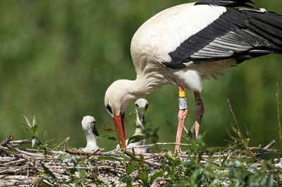 Im August ist Abflugszeit bei den Storchenfamilien. Ein erster Blick auf die Zahlen zeigt: Die Brutbilanz der Weißstörche im Land fällt erneut regional sehr unterschiedlich aus. Am Mittleren Oberrhein hat Horstbetreuer Eisenbarth 101 Jungstörche aus 86 Horsten beringt. Das sind knapp 1,2 Jungtiere je Elternpaar – gerade so viele wie nötig sind,um die aktuelle Weißstorchpopulation zu halten. In den Landkreisen Enzkreis und Ludwigsburg gab es trotz vieler Brutpaare nicht überall genügend erfolgreiche Bruten,um auf Dauer die aktuelle Population zu halten. Nördlich von Karlsruhe lag der Bruterfolg dagegen bei 2,1 Jungtieren: In 148 Horsten saßen 315 flügge Jungtiere.