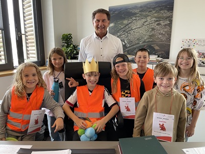 Zum Abschluss führte der Rathauskönig noch einmal die ganze Gruppe in den dritten Stock für ein Abschlussfoto mit Oberbürgermeister Klaus Heininger. Dort zeigte sich der frisch gekrönte Rathauskönig selbstsicher und nahm stolz auf dem Chefsessel Platz. Als erste Amtshandlung würde er allen Eislingern einen Gutschein für den Schwabenpark schenken,schlug er den Kindern vom Sommerferienprogramm vor.