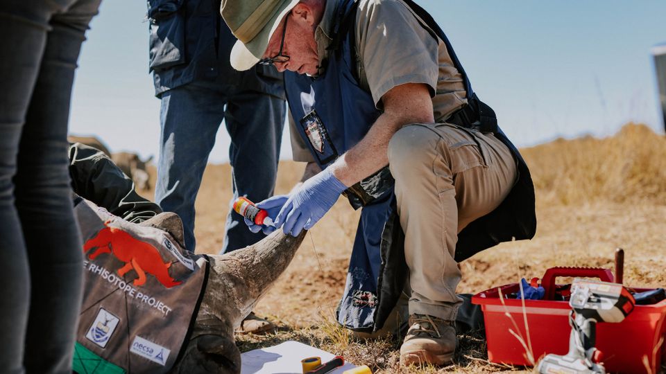 Ein Wissenschaftler injiziert radioaktive Isotope in das Horn eines Nashorns