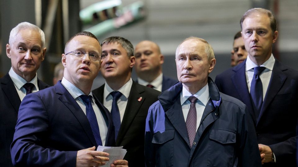 Russischer Präsident Wladimir Putin bei der Inspektion einer Rüstungsfabrik in Perm