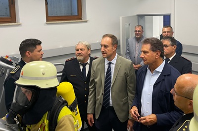 Im Beisein von Vertretern der Feuerwehren sowie der beteiligten Stellen konnten sich Landrat Markus Möller sowie Oberbürgermeister Klaus Heininger ein Bild von der Funktionsfähigkeit der Anlage machen. Beide zeigten sich beeindruckt von der praktischen Demonstration zweier junger Feuerwehrangehöriger.