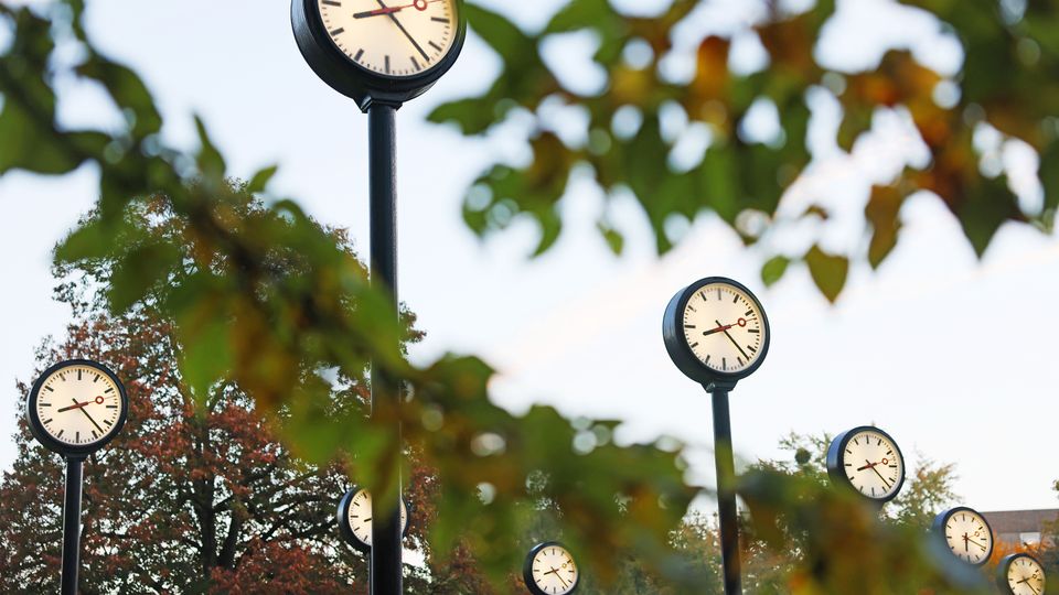 Zeitfeld im Düsseldorfer Volksgarten: In der Nacht zum 26. Oktober 2025 werden die Uhren eine Stunde zurückgestellt