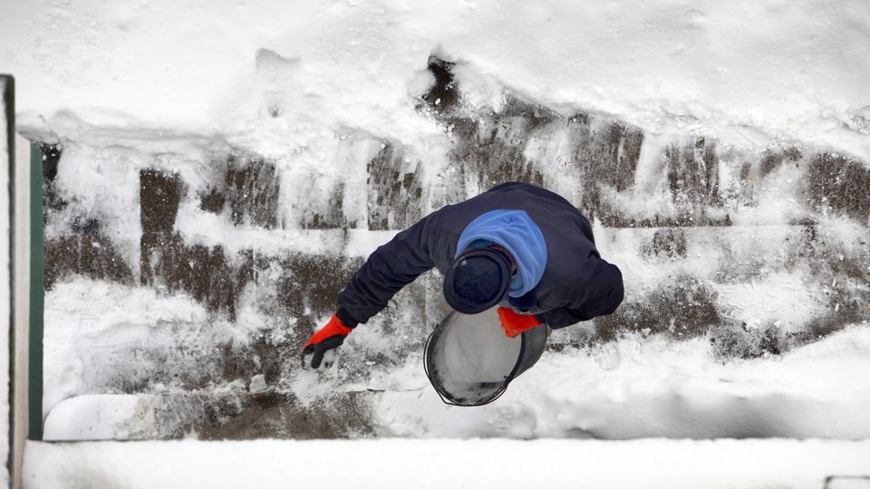 Mann streut Salz auf einen geräumten Gehweg: »In den meisten Kommunen verboten«