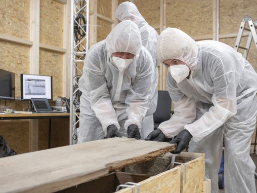 Expertenteam in Schutzkleidung hebt den Sargdeckel von Otto dem Großen: Der Herrscher gilt als Begründer des Heiligen Römischen Reichs